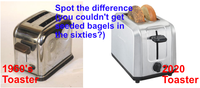 Hands up we are a fifty quid toaster couple. Yes, ours can toast 4 slices , heat bagels, defrost bread and lasts 9-10 years (average toaster life is 4-5 years) but we cannot guarantee that the bread gets toasted in the same way every time. However, the sixties toaster could do all that except toast 4 pieces. That’s toaster innovation for you.